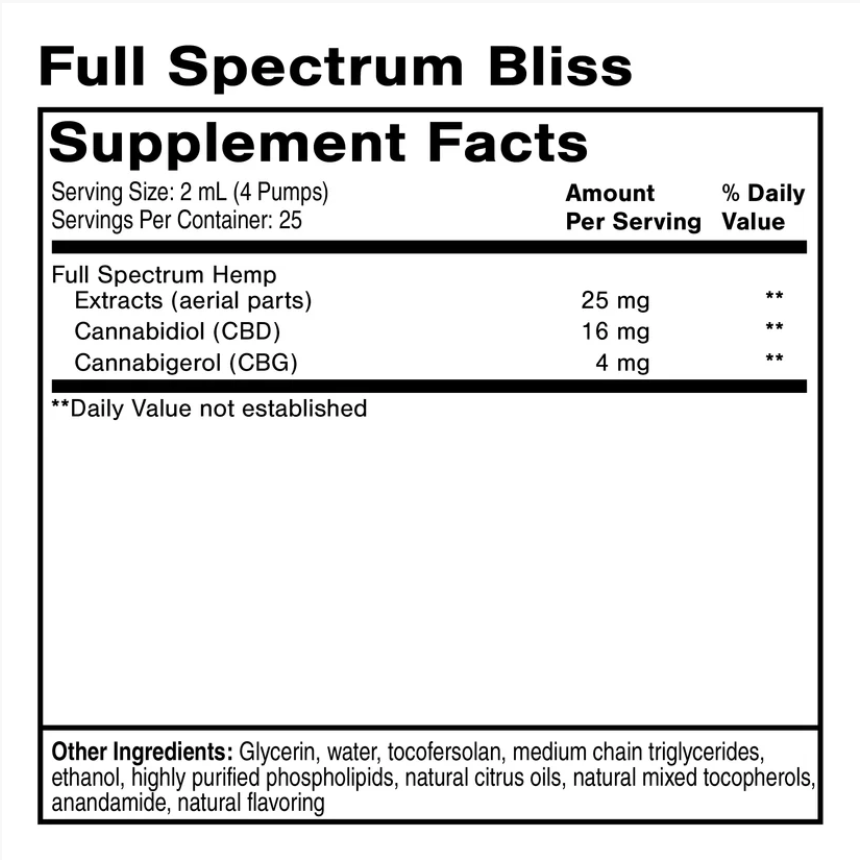 Full Spectrum Bliss supports a balanced mood and an overall sense of well-being. This blend offers the full suite of cannabinoids found in the hemp plant with additional cannabigerol (CBG), well known for its stress-reducing effects. We’ve also included the fatty acid, anandamide, aka the “bliss molecule”, for a full-body, feel-good effect.