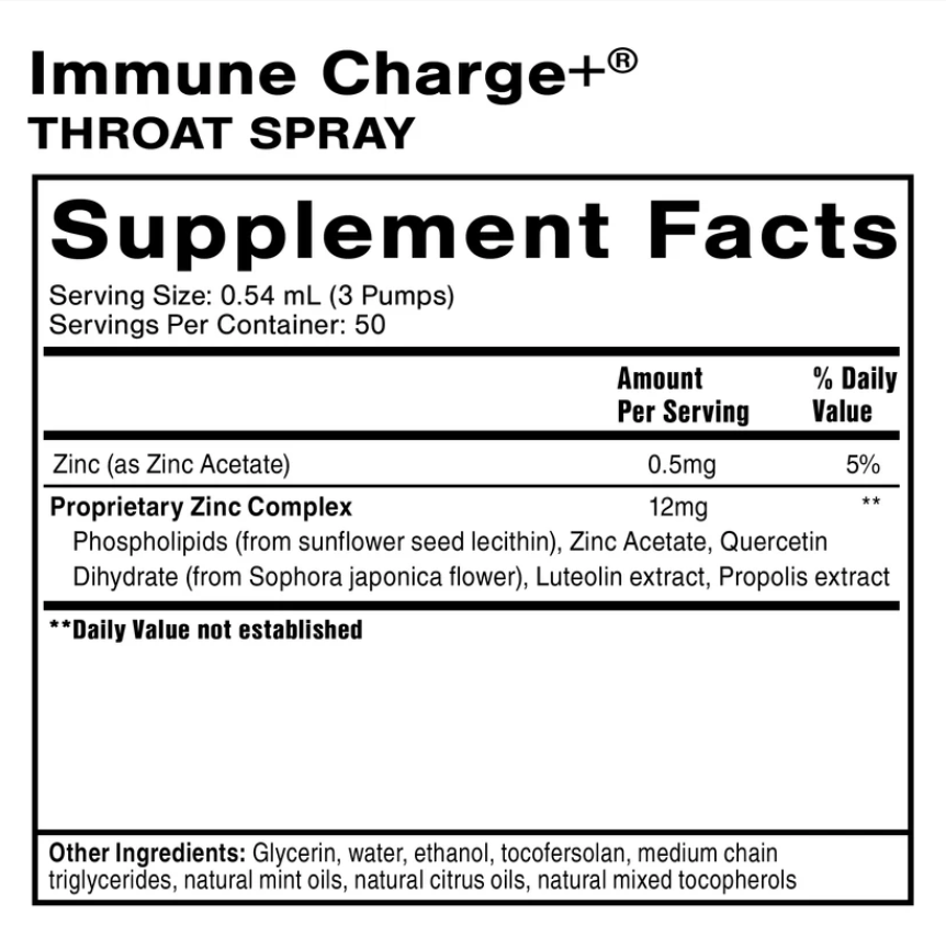 A highly bioavailable zinc-based spray designed to provide immune support in the throat. Zinc combined with quercetin, luteolin, and propolis helps increase zinc levels in the throat.